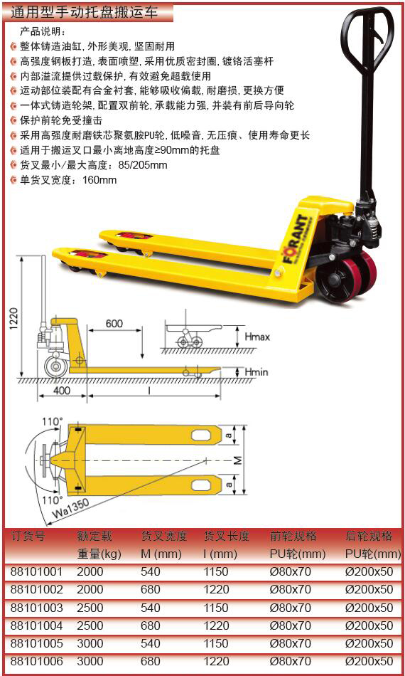 订货号 制造商型号 额定载重 货叉最低离地高度 货叉最高离地高度 货叉外宽 货叉长度 脚轮材质 车体颜色 前轮规格PU轮 后轮规格PU轮 价格 购物车