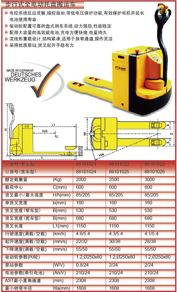 ·电控系统反应灵敏,操控自如,带低电压保护功能,有效保护电机并延长电池使用寿命. ·驱动轮配置可靠的盘式刹车系统,动力强劲,性能稳定 ·配用大容量的高效能电池,充电方便快捷,电量持久 ·流线形重载设计,结构紧凑,适用于狭窄通道,操作灵活 ·采用优质泵站,货叉起升平稳有力