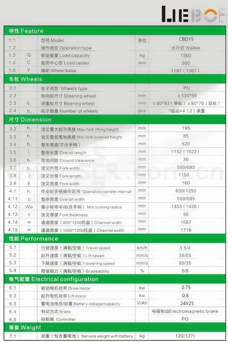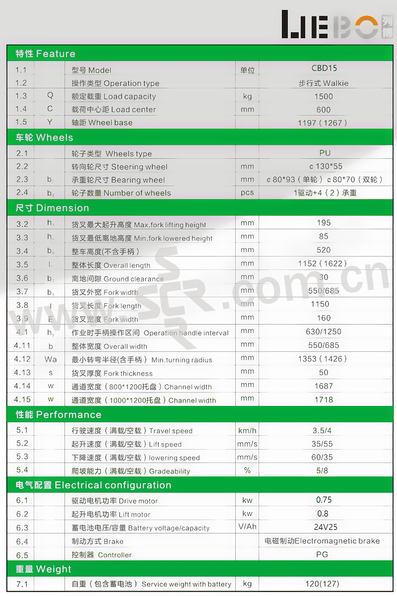 LIEBO/列博 步行式全电动搬运车 CBD15 载重1.5t 货叉550mm 1台