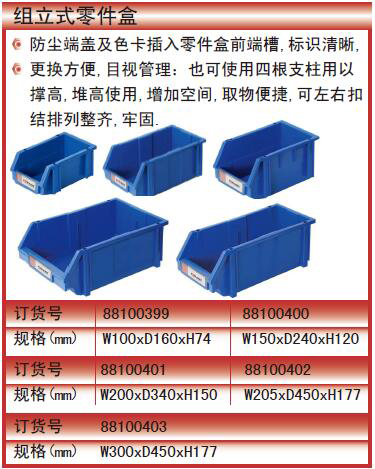 ·防尘端盖及色卡插入零件盒前端槽,标识清晰, ·更换方便,目视管理:也可使用四根支柱用以撑高,堆高使用,增加空间,取物便捷,可左右扣结排列整齐,牢固