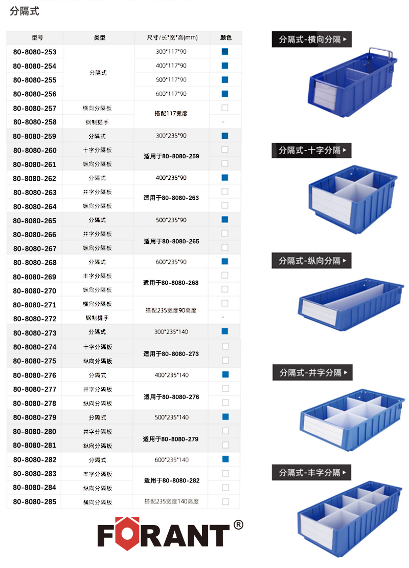订货号 制造商型号 外形尺寸(长×宽×高) 最多可用横/纵分数隔片 颜色 内径尺寸(长×宽×高) 价格 购物车