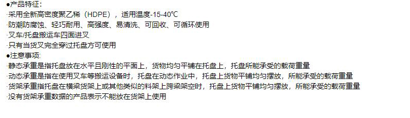 ·采用全新高密度聚乙稀(HDPE),适用温度-15-40℃ ·防潮防腐蚀、轻巧耐用、高强度、易清洗、可回收、可循环使用 ·叉车/托盘搬运车四面进叉 ·只有当货叉完全穿过托盘方可使用
