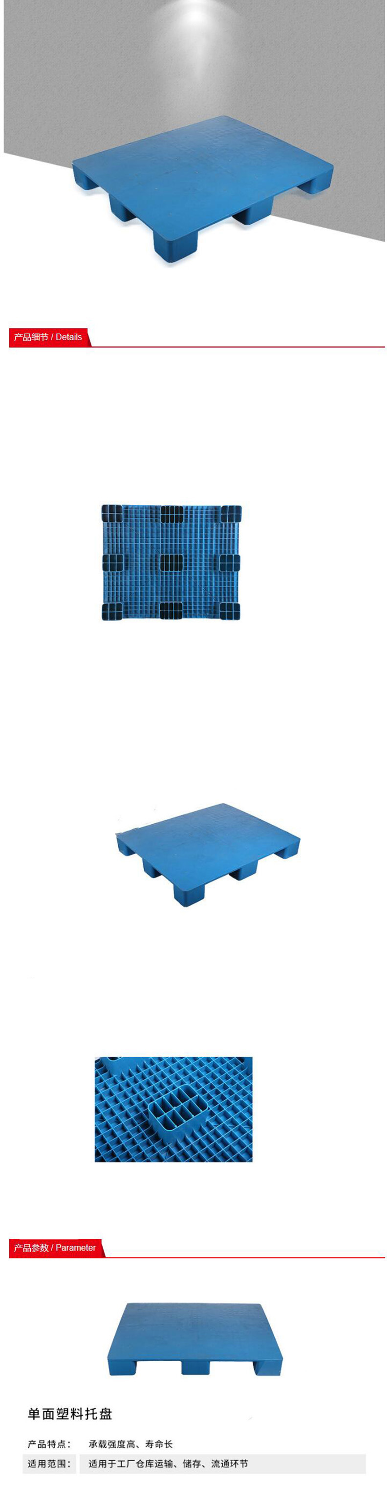 ·承载强度高:采用低压高密度聚乙烯生产 ·长寿命:耐酸碱、不腐烂、便于清洗.使用寿命是木托盘的5~7倍