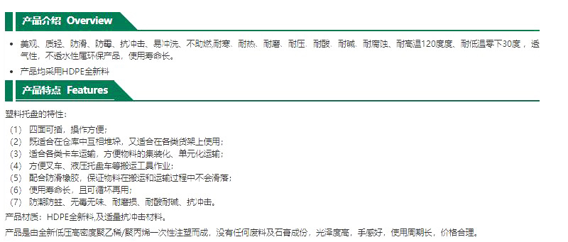 ·塑料托盘的特性: ·四面可插,操作方便; ·既适合在仓库中互相堆垛,又适合在各类货架上使用; ·适合各类卡车运输,方便物料的集装化、单元化运输; ·方便叉车、液压托盘车等搬运工具作业; ·配合防滑橡胶,保证物料在搬运和运输过程中不会滑落; ·使用寿命长,且可循坏再用; ·防潮防蛀、无毒无味、耐磨损、耐酸耐碱、抗冲击。 ·产品材质:HDPE全新料,及适量抗冲击材料。 ·产品是由全新低压高密度聚乙稀/聚丙烯一次性注塑而成,没有任何废料及石膏成份,光泽度高,手感好,使用周期长,价格合理。