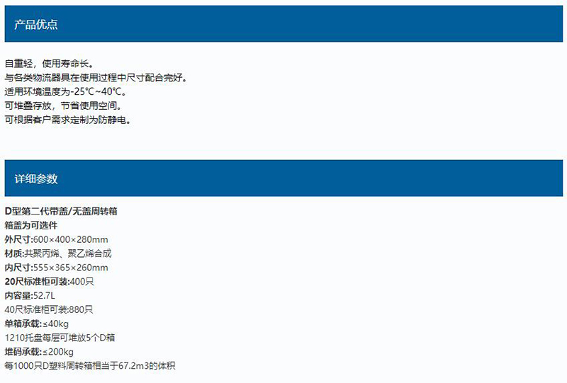 ·材质为共聚丙烯、聚乙烯合成 ·自重轻,使用寿命长 ·与各类物流器具在使用过程中尺寸配合完好 ·适用环境温度为-25℃~40℃ ·可堆叠存放,节省使用空间 ·可根据客户需求定制为防静电