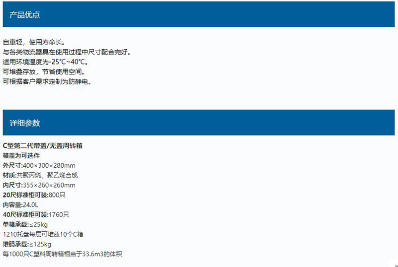 ·材质为共聚丙烯、聚乙烯合成 ·自重轻,使用寿命长 ·与各类物流器具在使用过程中尺寸配合完好 ·适用环境温度为-25℃~40℃ ·可堆叠存放,节省使用空间 ·可根据客户需求定制为防静电