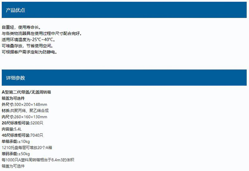 ·材质为共聚丙烯、聚乙烯合成 ·自重轻,使用寿命长 ·与各类物流器具在使用过程中尺寸配合完好 ·适用环境温度为-25℃~40℃ ·可堆叠存放,节省使用空间 ·可根据客户需求定制为防静电