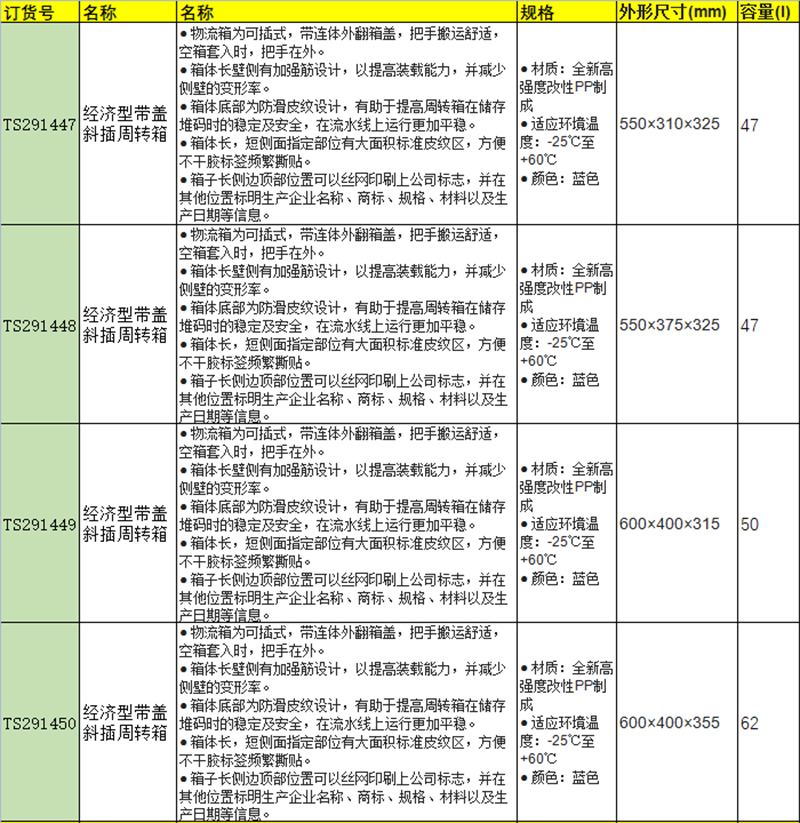 订货号 制造商型号 外形尺寸(长×宽×高) 颜色 内径尺寸 材质 单箱承重 堆码承重 容量 价格 购物车
