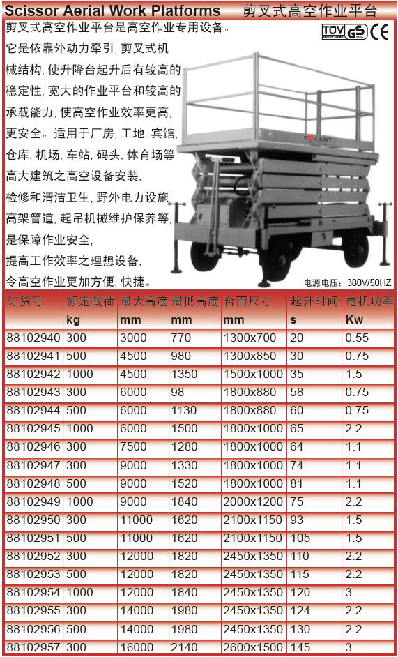 ·剪叉式高空作业平台是高空作业专用设备。 ·它是依靠外动力牵引,剪叉式机械结构,使升降台起升后有较高的稳定性,宽大的作业平台和较高的承载能力,使高空作业效率更高,更安全。 ·高大建筑之高空设备安装,检修和清洁卫生,野外电力设施高架管道,起吊机械维护保养等, ·是保障作业安全,提高工作效率之理想设备,令高空作业更加方便,快捷。