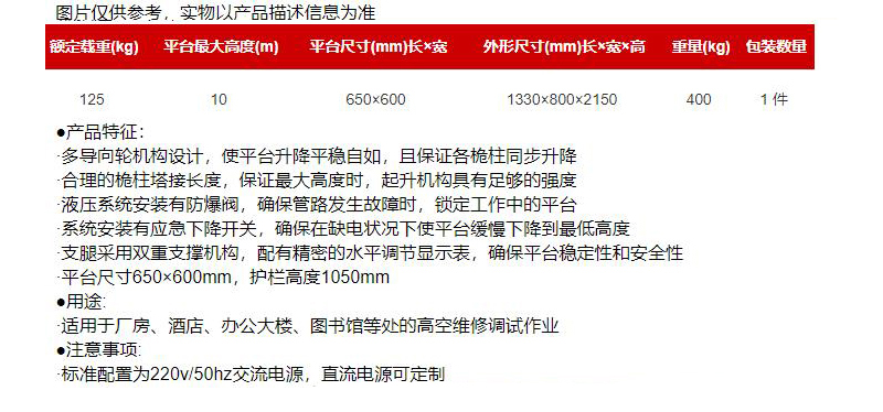 ·多导向轮机构设计,使平台升降平稳自如,且保证各桅柱同步升降 ·合理的桅柱塔接长度,保证最大高度时,起升机构具有足够的强度 ·液压系统安装有防爆阀,确保管路发生故障时,锁定工作中的平台 ·系统安装有应急下降开关,确保在缺电状况下使平台缓慢下降到最低高度 ·支腿采用双重支撑机构,配有精密的水平调节显示表,确保平台稳定性和安全性 ·平台尺寸650×600mm,护栏高度1050mm