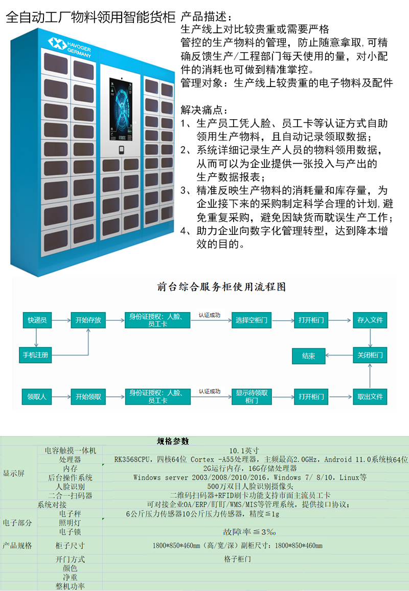"1、生产员工凭人脸、员工卡等认证方式自助领用生产物料,且自动记录领取数据; 2、系统详细记录生产人员的物料领用数据,从而可以为企业提供一张投入与产出的生产数据报表; 3、精准反映生产物料的消耗量和库存量,为企业接下来的采购制定科学合理的计划,避免重复采购,避免因缺货而耽误生产工作; 4、助力企业向数字化管理转型,达到降本增效的目的。"