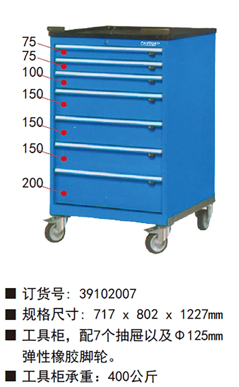 配7个抽屉以及Φ125mm弹性橡胶脚轮。