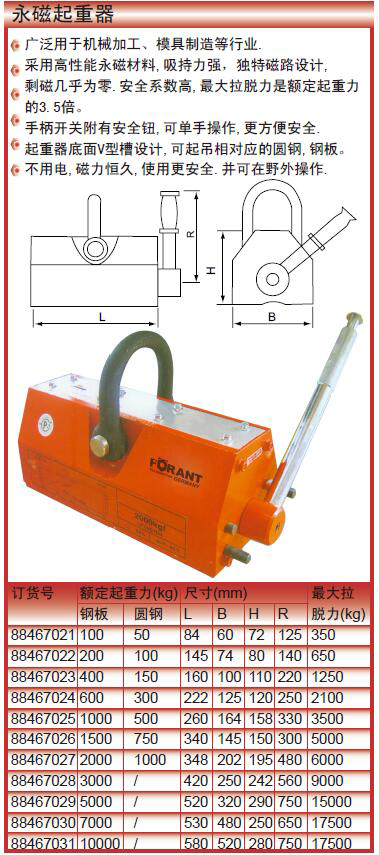 ·采用高性能永磁材料,吸持力强,独特磁路设计,剩磁几乎为零.安全系数高,最大拉脱力是额定起重力的3.5倍。