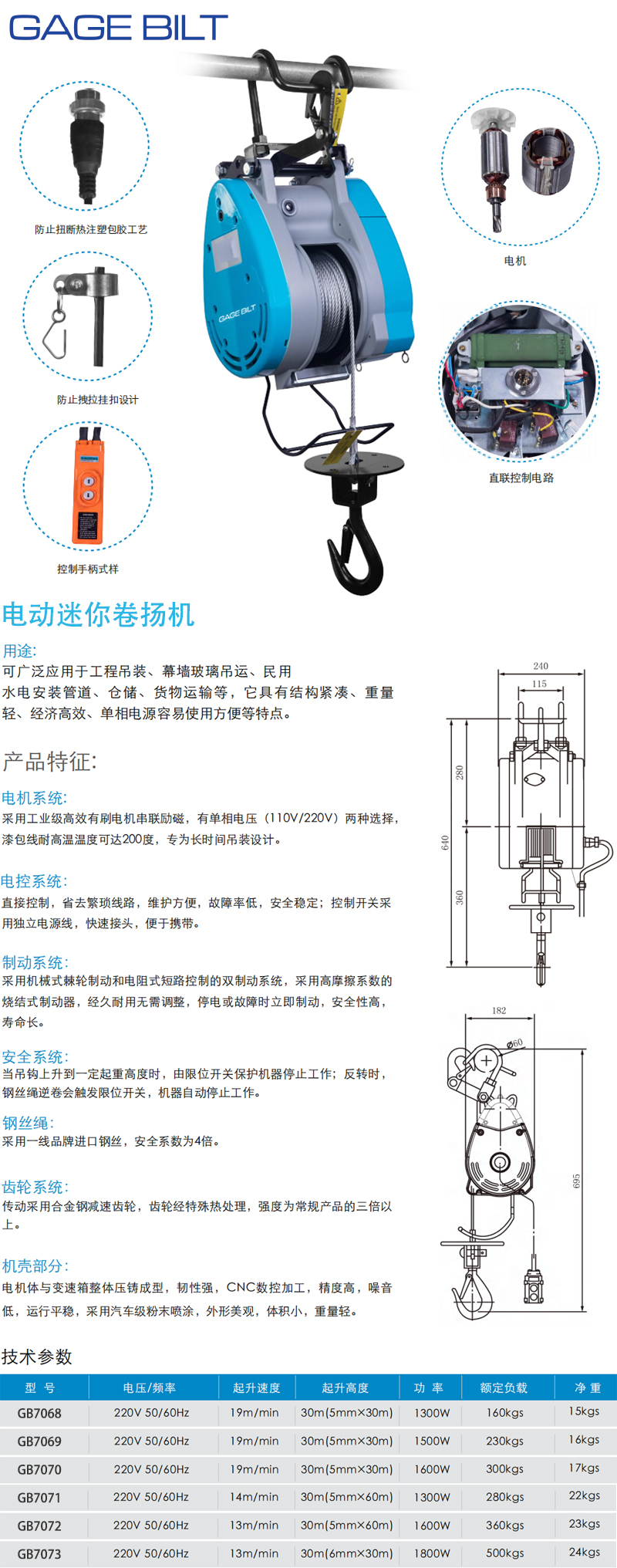 ·采用工业级高效有刷电机串联励磁,有单相电压(110V/220V)两种选择, ·漆包线耐高温温度可达208度,专为长时间吊装设计。
