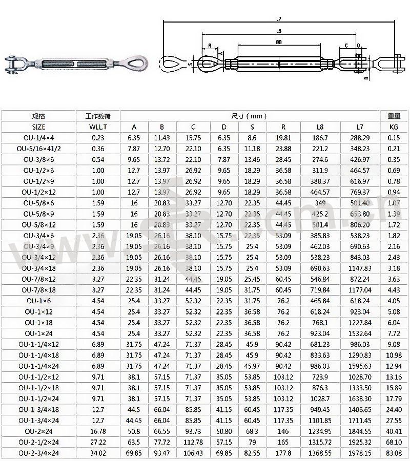 .主要用于货物的拉紧,并可起调节松紧作用..可提供美标花兰螺丝及船用花篮螺丝..安全系数4:1..美标花兰螺丝符合ASME B30.26要求.采用高强度合金钢锻制,提供产品测试报告证书..仅限用于直拉或直线受力.
