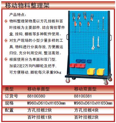 ·物料整理架物是以方孔挂板和百 叶挂板为主要部件,结合背挂零件 盒,挂钩,棚板等多种配件使用。 ·对生产现场的小型少量多样的工 具,物料进行分类存放,方便搬运 归为,充分利用空间,整洁高效。 ·根据使用分为单面和双门型, 加装2定2万向PU脚轮及把手, 可方便移动,脚轮每只承重90kg