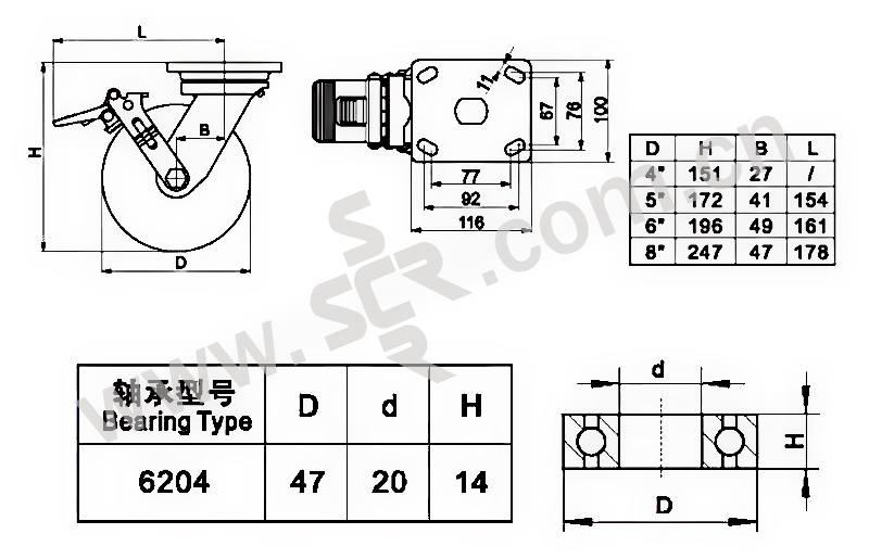 EDL/易得力 镀锌8寸平顶万向高强度尼龙TPA脚轮 78128E-788-26/E 载重900kg 底板规格116×100mm 安装高度247mm 1只