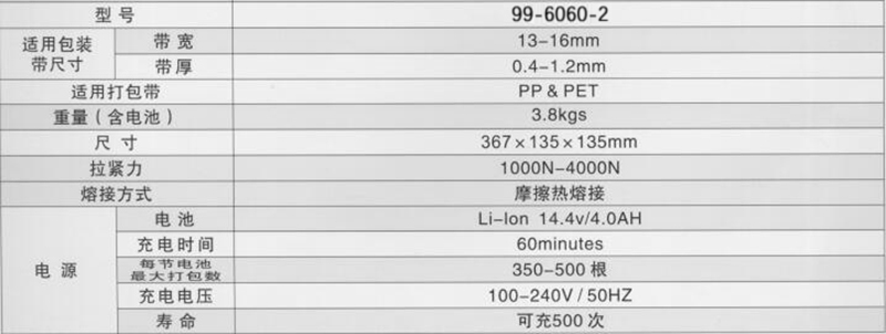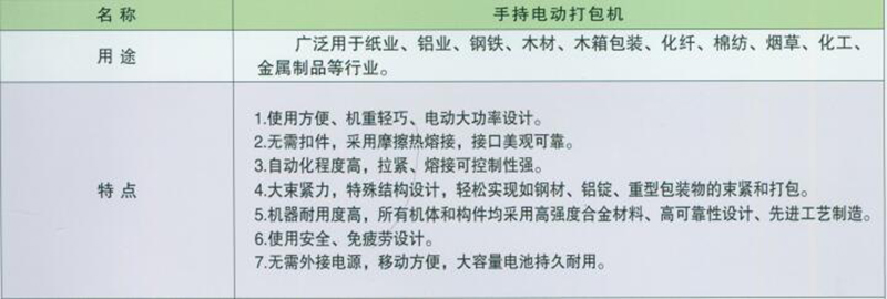 ·使用方便、机重轻巧、电动大功率设计 ·无需扣件,采用摩擦热熔接,接口美观可靠。 ·自动化程度高,拉紧、熔接可控制性强 ·大束紧力,特殊结构设计,轻松实现如钢材、铝锭、重型包装物的束紧和打包 ·机器耐用度高,所有机体和构件均采用高强度合金材料、高可靠性设计、先进工艺制造。 ·使用安全、免疲劳设计。 ·无需外接电源,移动方便,大容量电池持久耐用。