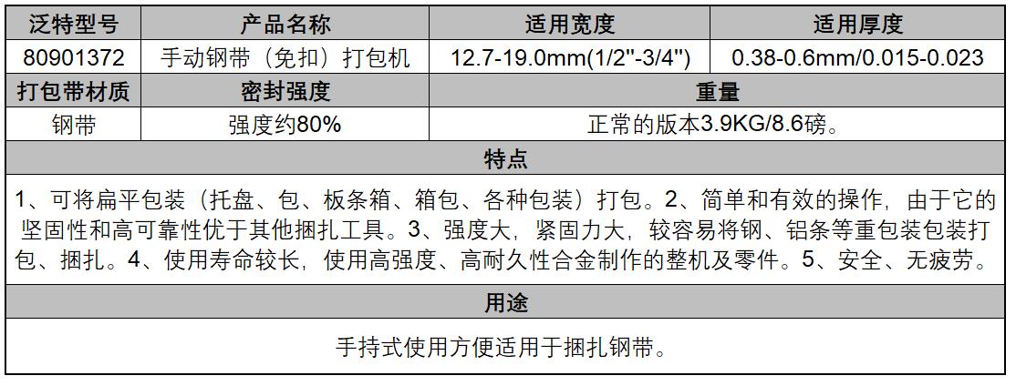 ·可将扁平包装(托盘、包、板条箱、箱包、各种包装)打包。 ·简单和有效的操作,由于它的坚固性和高可靠性优于其他捆扎工具。 ·强度大,紧固力大,容易将钢、铝条等重包装包装打包、捆扎。 ·使用寿命长,使用高强度、高耐久性合金制作的整机及零件。 ·专利设计,安全、无疲劳。