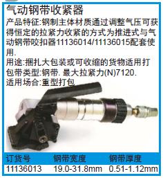·产品特征:钢制主体材质通过调整气压可获得恒定的拉紧力收紧的方式为推进式与气动钢带咬扣器11136014/11136015配套使用. 用途:捆扎大包装或可收缩的货物适用打 包带类型:钢带.最大拉紧力(N)7120. 适用场合:重型打包