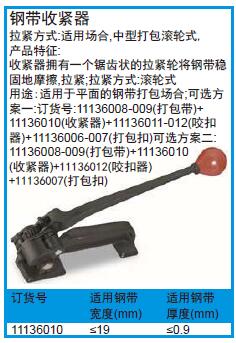 ·紧方式:适用场合,中型打包滚轮式, ·产品特征:收紧器拥有一个锯齿状的拉紧轮将钢带稳固地摩擦,拉紧;拉紧方式:滚轮式 ·用途:适用于平面的钢带打包场合;可选方案一:订货号:11136008-009(打包带)+11136010(收紧器)+11136011-012(咬扣器)+11136006-007(打包扣)可选方案二:11136008-009(打包带)+11136010(收紧器)+11136012(咬扣器)+11136007(打包扣)