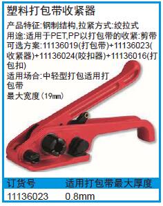 ·可选方案:11136019(打包带)+11136023(收紧器)+11136024(咬扣器)+11136016(打包扣) ·适用于PET,PP以打包带的收紧剪带 ·中轻型打包适用打包带最大宽度(19mm)