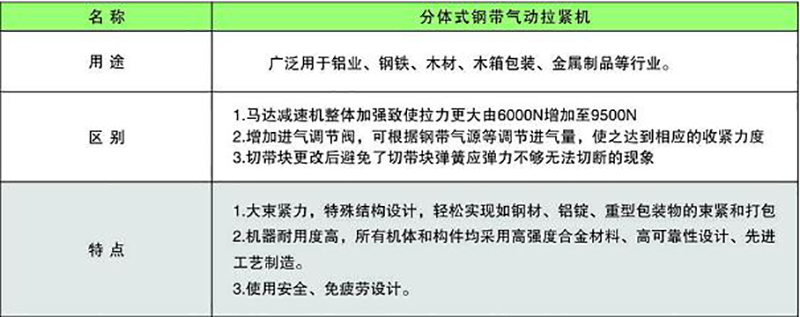·大束紧力,特殊结构设计,轻松实现如钢材、铝锭、重型包装物的束紧和打包 ·机器耐用度高,所有机体和构件均采用高强度合金材料、高可靠性设计、先进工艺制造。 ·使用安全、免疲劳设计。