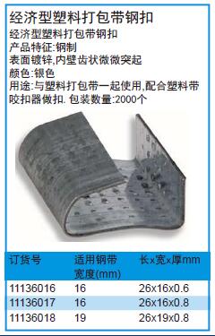 ·钢制表面镀锌,内壁齿状微微突起与塑料打包带一起使用,配合塑料带咬扣器做扣.包装数量2000个