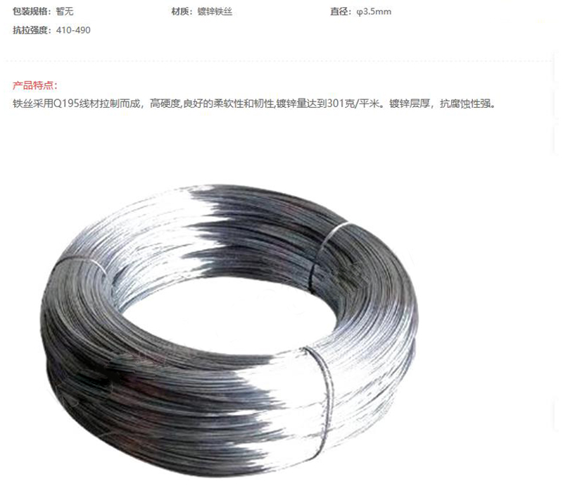 ·铁丝采用Q195线材拉制而成,高硬度,良好的柔软性和韧性,镀锌量达到301克/平米,镀锌层厚,抗腐蚀性强