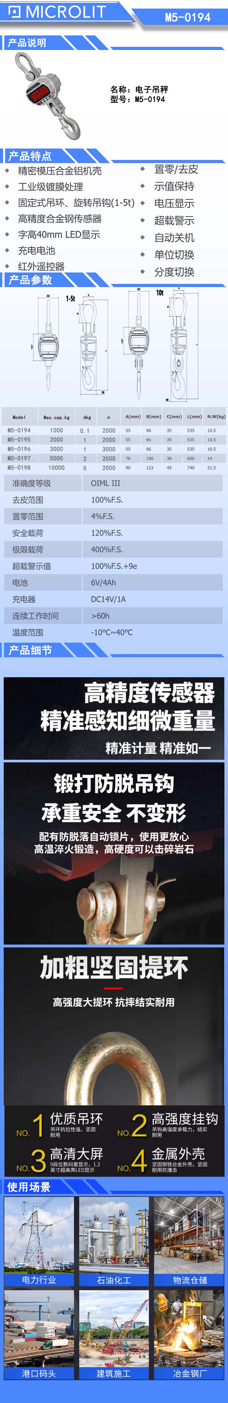 * 精密模压合金铝机壳 * 工业级镀膜处理 * 合金钢吊环、吊钩(旋转吊钩1-5t可选) * 高精度合金钢传感器 * 字高40mmLED显示 * 4位功能按键 * 更换式充电电池 * 红外遥控器