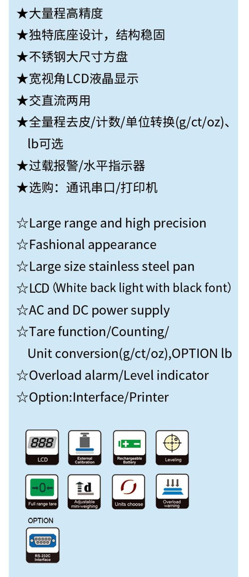 ·全量程去皮/计数/单位转换(g/ct/oz)、lb可选