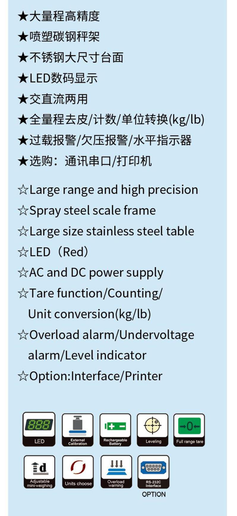·大量程高精度 ·喷塑碳钢秤架 ·不锈钢大尺寸台面 ·LED数码显示 ·交直流两用 ·全量程去皮/计数/单位转换(kg/lb) ·过载报警/欠压报警/水平指示器 ·选购:通讯串口/打印机