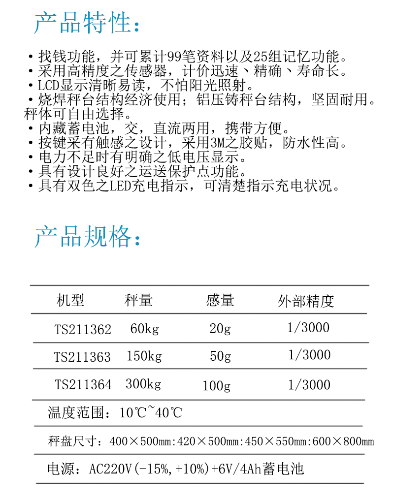 ·具有自动更正、自动零点追踪、双重之过载保护之功能 ·具有多种单位选择之功能 ·按键采有触感之设计,采用3M之胶贴防水性高