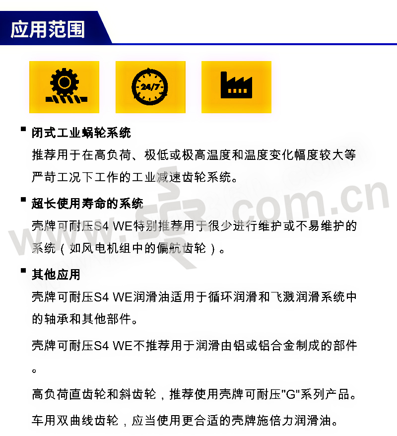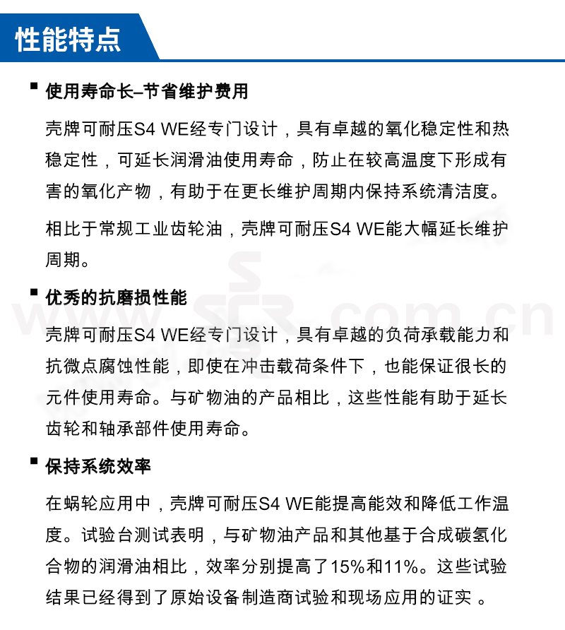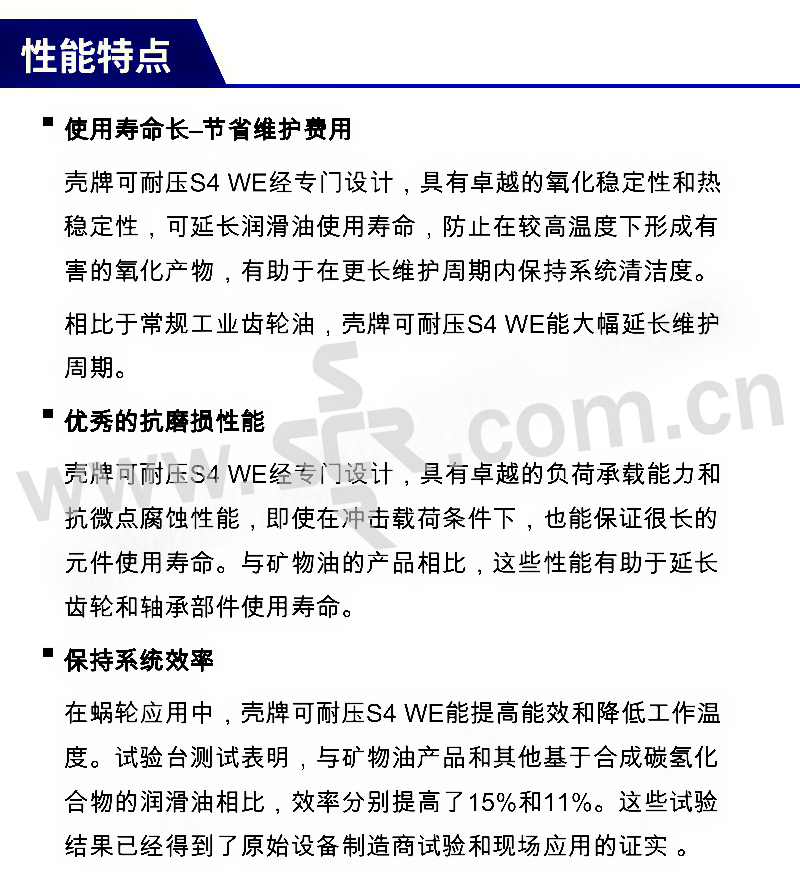 ·寿命长: 通过Flender AG 在80℃下使用2万小时(4年)的正式认证。 ·抗磨损: 具有卓越的负荷承载能力和抗微点蚀性能,即使在冲击负荷条件下,也能确保很长的组件使用寿命。 ·效率高: 试验表明,与矿物油产品和其他基于合成碳氢化合物的润滑油相比,效率分别提高了15%和11%。
