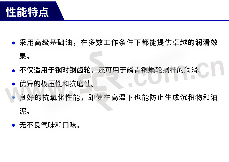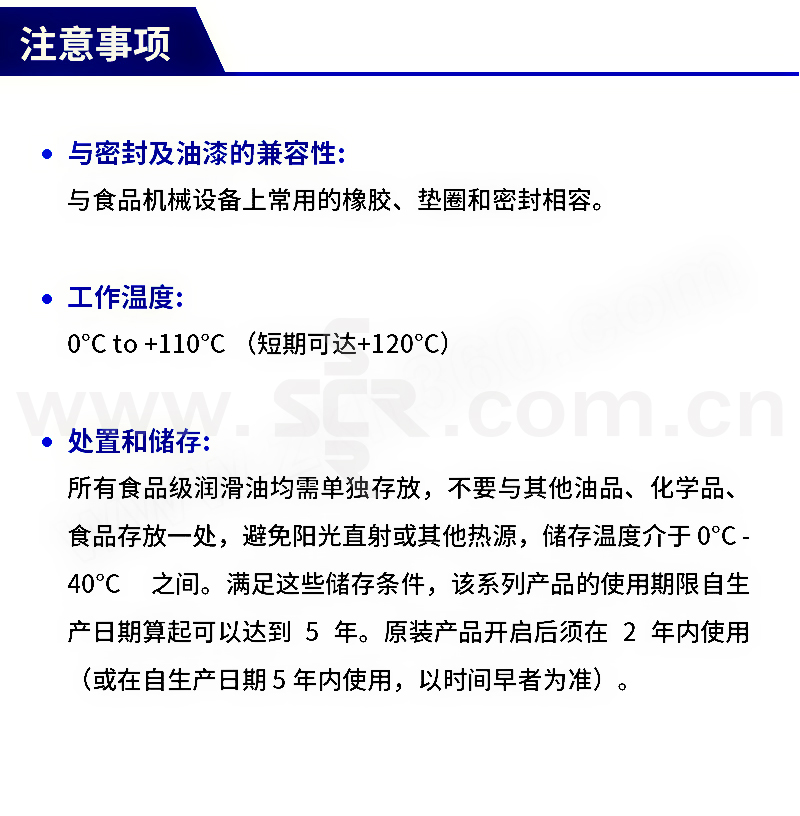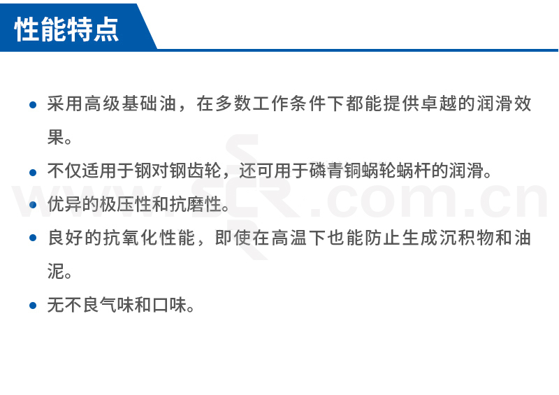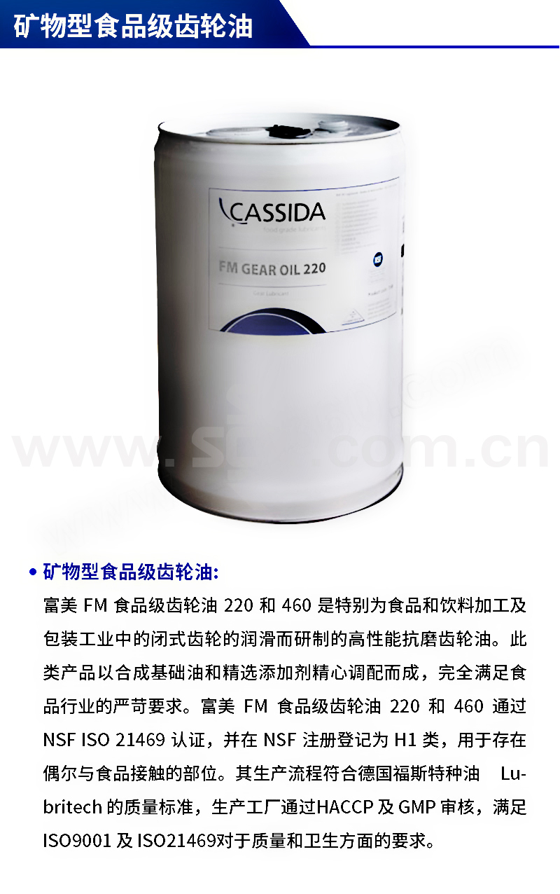 ·权威认证: 符合NSF H1认证、ISO 21469卫生管理体系认证、Halal伊斯兰教食品法规、Kosher犹太教食品法规。 ·性能卓越:优异的极压性能和精选的添加剂配方,杰出的润滑性能。 ·成分安全:无不良气味和口味,不含从动物或转基因生物提取的物质。 ·产品标准:DIN 51517 CLP、ISO 6743/6 L-CKC。