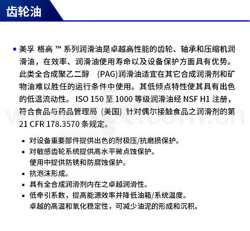 ·高水平微点蚀保护。 ·优异的防锈和防腐蚀保护。 ·优良的抗泡性能:有效防止泡沫产生并具有低牵引系数。