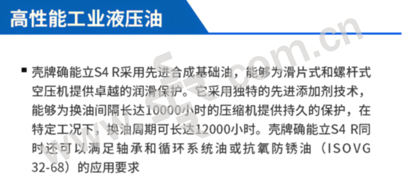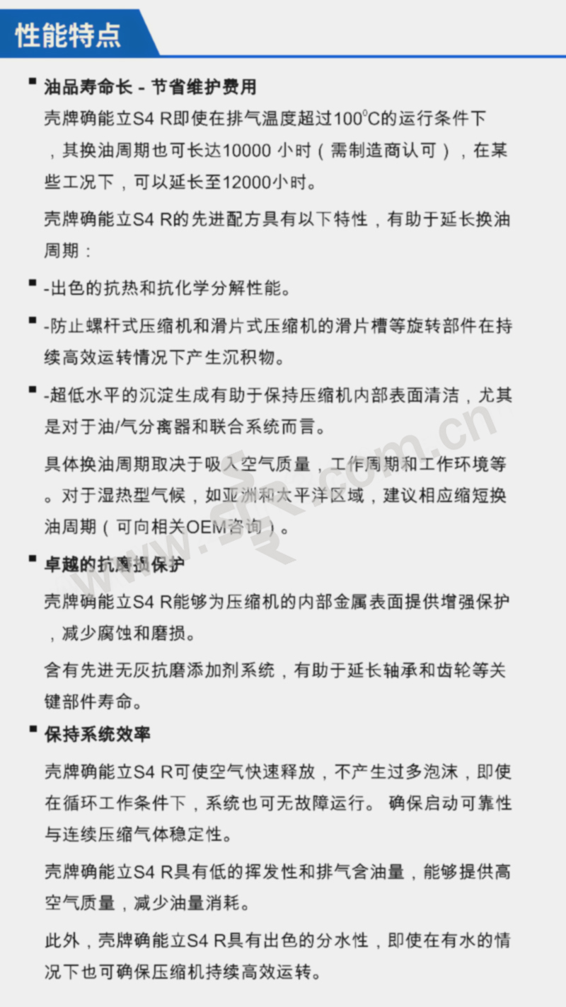 ·换油期超长: 在排气温度超过100℃的运行条件下,其换油周期也可长达12000小时(需制造商认可)。 ·性能稳定: 出色的抗热和抗化学分解性能,保证稳定的油品性能。 ·抗 磨 损: 含有先进的无灰抗磨损添加剂,有效保护压缩机内部金属表面,减少腐蚀和磨损。
