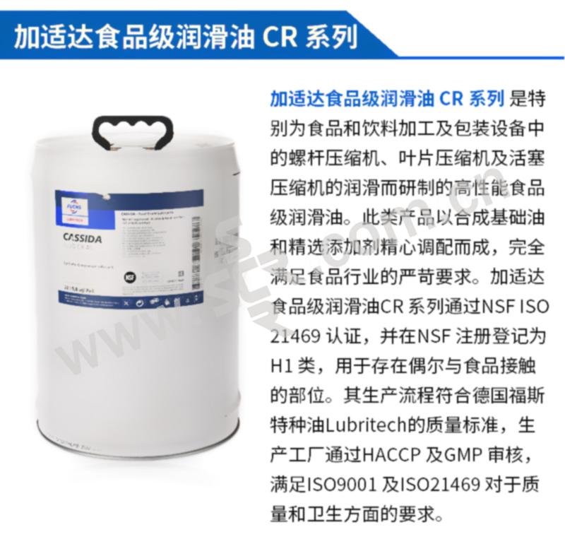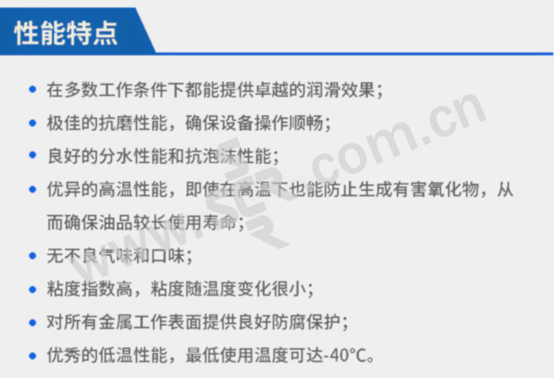 ·权威认证: 符合NSF H1认证、ISO 21469卫生管理体系认证、Halal伊斯兰教食品法规、Kosher犹太教食品法规。 ·性能卓越: 极佳的抗磨性能,减少停机风险;卓越的抗氧化性能,超长使用寿命。 ·成分安全: 无不良气味和口味,不含从动物或转基因生物提取的物质。 ·产品标准: DIN 51506 VBL、VCL、VDL、ISO 6743/3 L-DAG、DAH、DAJ。