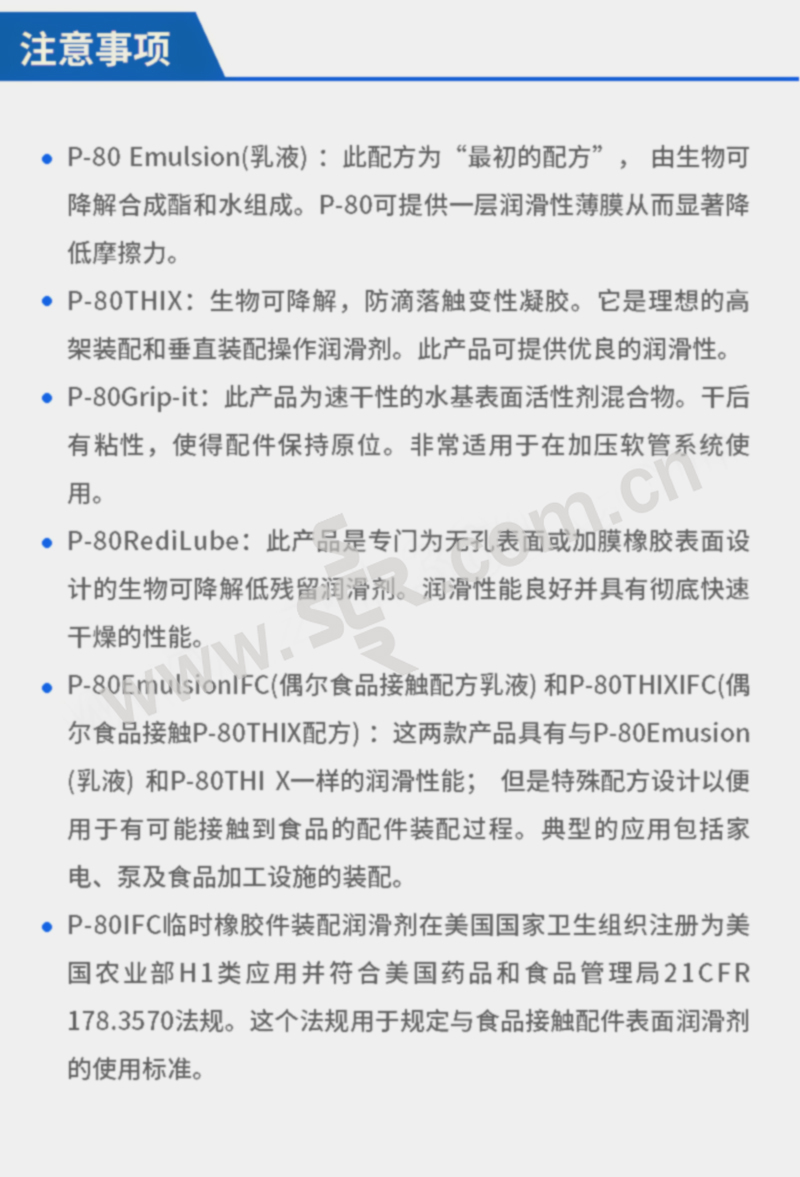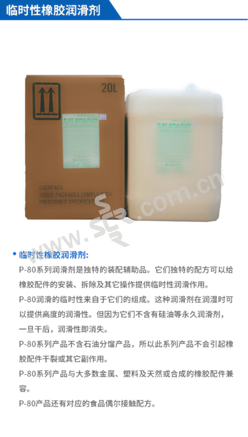 · P-80橡胶润滑剂具有高效的临时润滑作用,使橡胶与金属件之间易于安装拆卸、或其他方式处理,操作完成后橡胶润滑剂会完全挥发消失,不会留下任何痕迹