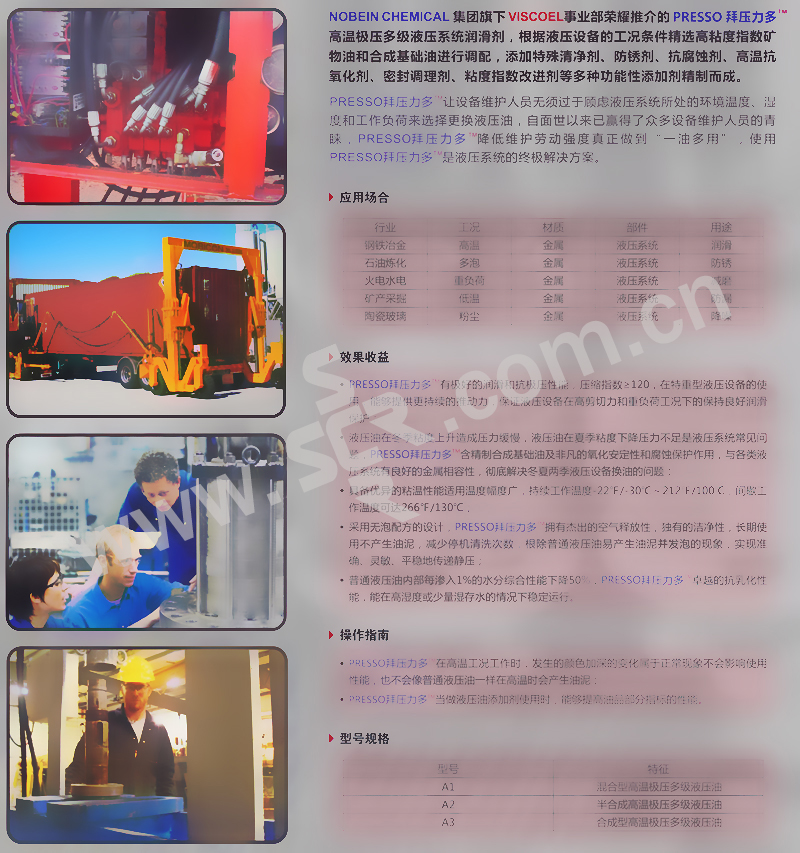 ·高温极压多级液压系统润滑剂,根据液压设备的工况条件精选高粘度指数矿物油和合成基础油进行调配,添加特殊清净剂、防锈剂、抗腐蚀剂、高温抗氧化剂、密封调理剂、粘度指数改进剂等多种功能性添加剂精制而成。·让设备维护人员无须过于顾虑液压系统所处的环境温度、湿度和工作负荷来选择更换液压油,自面世以来已赢得了众多设备维护人员的青睐,降低维护劳动强度真正做到“一油多用”的综合解决方案。