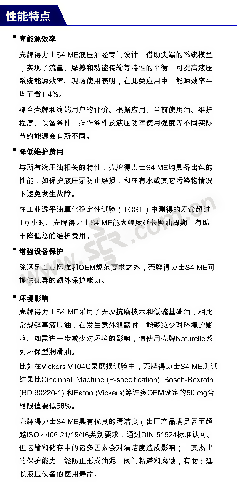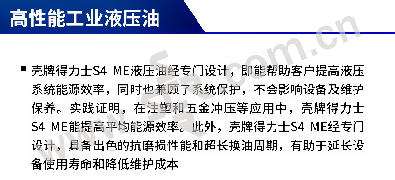 ·能源效率高:液压系统能源效率平均可提高8%。 ·维护费用低:杰出的氧化稳定性。 ·抗磨保护好: 非凡的抗磨保护,在威克士(Vickers)V104C试验中的磨损量比标准限值低于68%。 ·环境影响小: 采用了无灰抗磨技术和低硫基础油,相比与常规含锌液压油,在发生意外泄漏时,减少了对环境的影响。