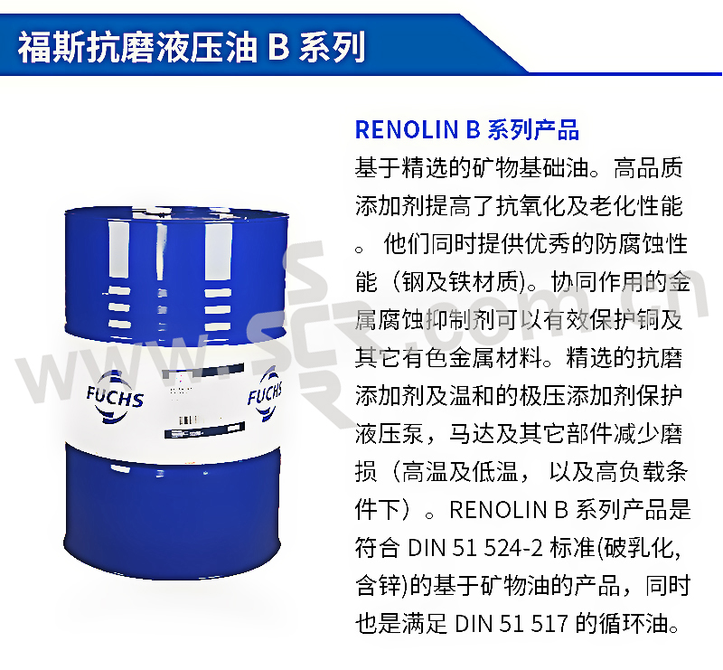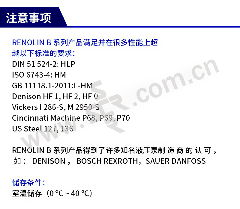 · RENOLIN B系列产品基于精选的矿物基础油,高品质添加剂提高了抗氧化及老化性能。他们同时提供优秀的防腐蚀性能(铁和钢材质)。协同作用的金属腐蚀抑制剂可以有效保护铜及极压添加剂保护液压泵,马达及其他部件减少磨损(高温及低温,以及高负载条件下)。· RENOLIN B系列产品是符合DIN 51524-2标准(破乳性,含锌)的基于矿物油的产品,同时也是满足SIN 51517的循环油。主要特点:良好的抗磨损/极压性能良好的粘温特性优秀的氧化及老化稳定性优秀