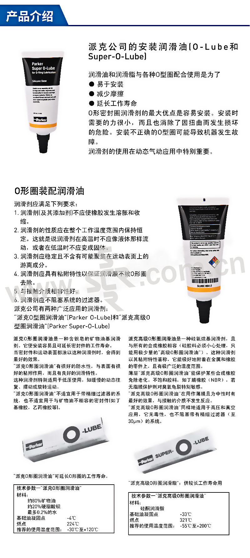 · 派克高级O形圈润滑油是一种硅氧烷基润滑剂,且与所有的合成橡胶相容(硅胶料必须小心处理,只能用极少量的“高级o形圈润滑油”)。