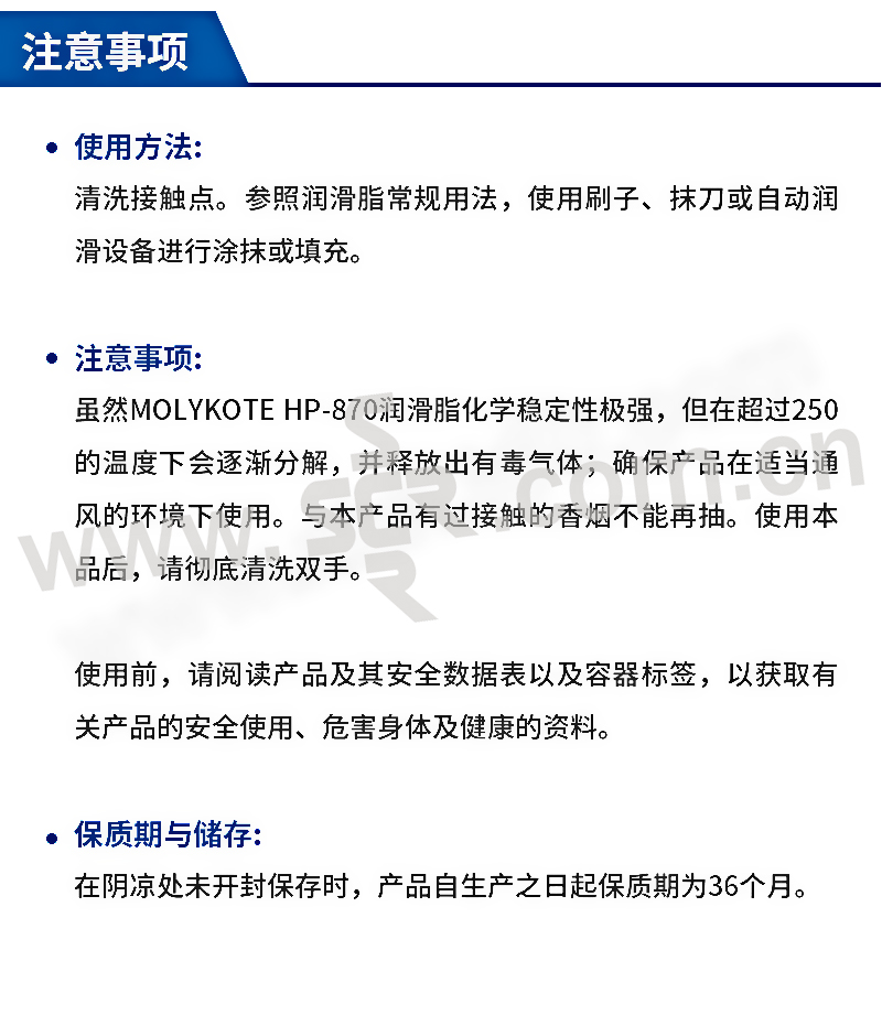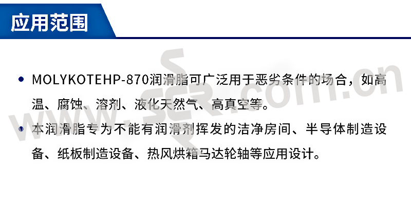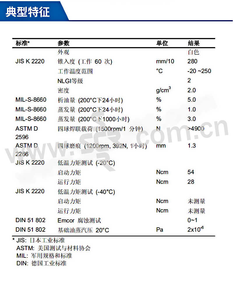·长效润滑:高温蒸发度和化学反应活性极低。 ·承载能力强:四球焊联载荷高于4900N。 · 耐热耐腐蚀: 特殊改进的耐腐蚀剂,耐强酸强碱、耐溶剂,满足高温环境应用。 ·耐 水 性:水冲淋环境下保证润滑效果。 ·兼容性优:与多种塑料及弹胶体相容。
