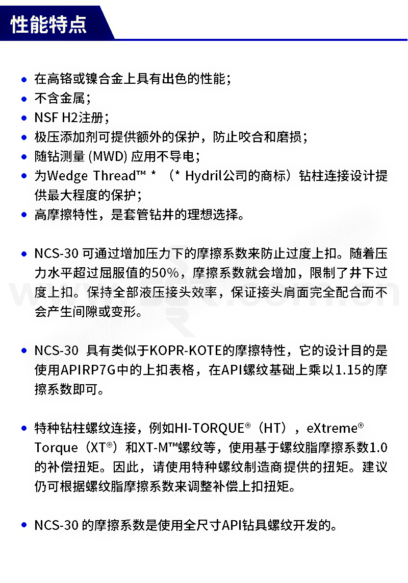 ·NCS-30 是一款优质的非导电、非金属螺纹化合物,含有碳纤维和多种添加剂及其它天然极压添加剂和抗磨添加剂。·NCS-30 的基脂是 JET-LUBE 研发的高温钙复合基润滑脂,这种新型的基础润滑脂具有额外的优势,即对潮湿的钢铁表面具有超群的附着力,耐水冲洗,以及耐绝大多数钻井液,同时对反相或高pH值钻井液特别有效。· 在高铬或镍合金上具有出色的性能· 不含金属· NSF H2注册· 极压添加剂可提供额外的保护,防止咬合和磨损· 随钻测量 (M