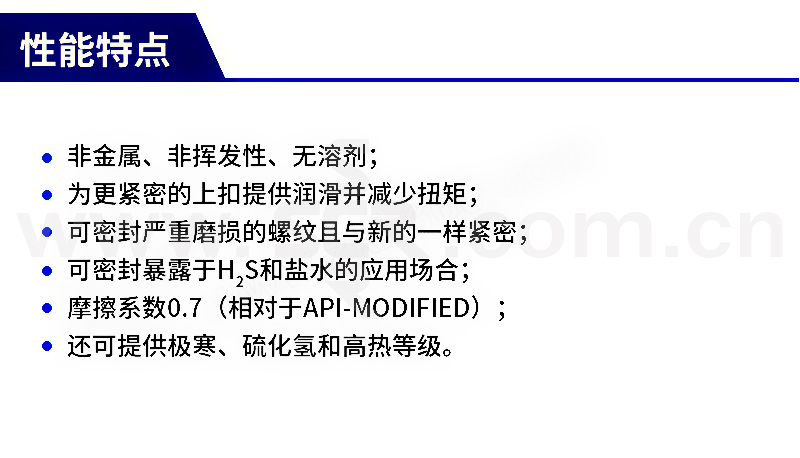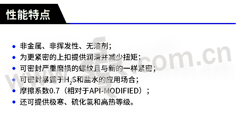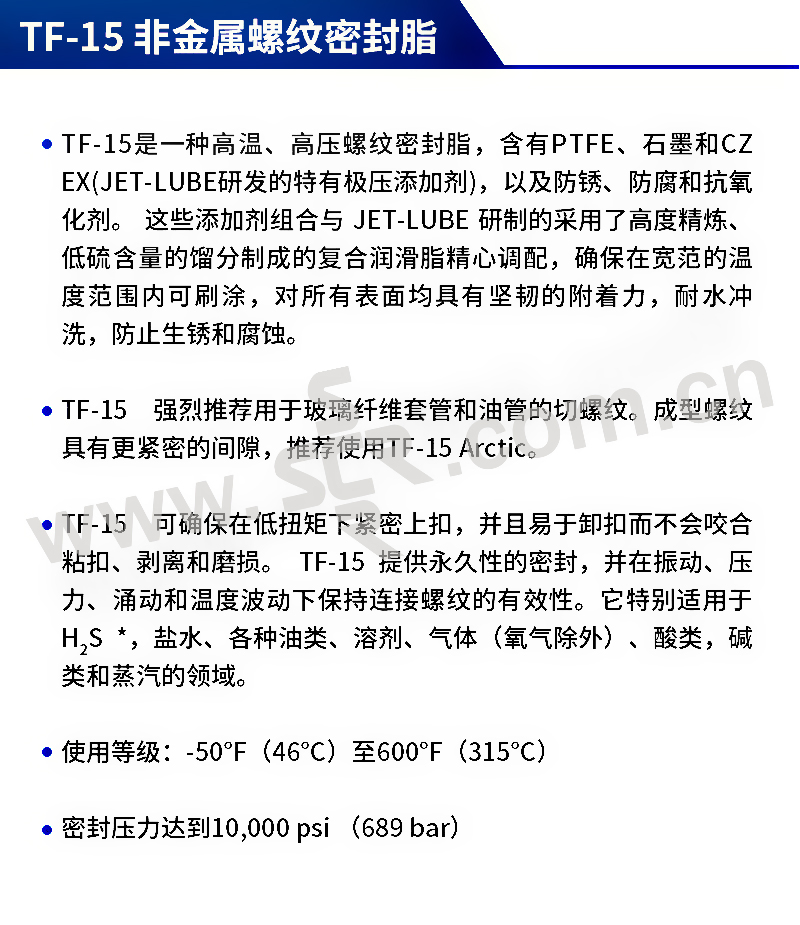 ·TF-15 是一种高温、高压螺纹密封脂,含有PTFE、石墨和CZ-EX (JET-LUBE研发的特有极压添加剂),以及防锈、防腐和抗氧化剂。 这些添加剂组合与 JET-LUBE 研制的采用了高度精炼、低硫含量的馏分制成的复合润滑脂精心调配,确保在宽范的温度范围内可刷涂,对所有表面均具有坚韧的附着力,耐水冲洗,防止生锈和腐蚀。·使用等级:-50°F(46°C)至600°F(315°C)·密封压力达到10,000 psi (689 bar)·TF-15 强烈推荐用于玻璃纤维套管