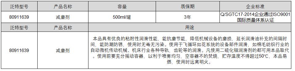 ·本品具有优良的粘附性润滑性能,能抗磨节能,降低机械设备的磨损,延长润滑油补充的间隔时间,能防潮防锈,使用时无毒无污染。使用于飞循环如花系统的设备部件润滑,如棉毛纺织行业的自动微机传动机械、机床行业各种导轨,齿轮等的润滑。凡使用二硫化钼润滑剂的都可用本品取代。使用前要充分摇动容器,以利于喷雾均匀,空容器不的焚烧,贮存温度不得超过50℃,本品易燃,使用时远离明火。