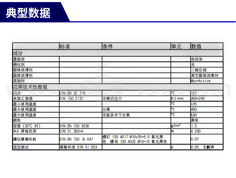 ·在极高负荷条件下针对刮伤、磨损和回滑具备立竿见影的防护效果;·无需与滑动面组合使用;·二硫化钼对金属具有强亲和力因而效果显著;·具备最高负荷能力同时能将摩擦降到最低;·通过紧急运行性能提高运转机械零部件的操作安全性;·含有用于提高性能的有机钼化合物。