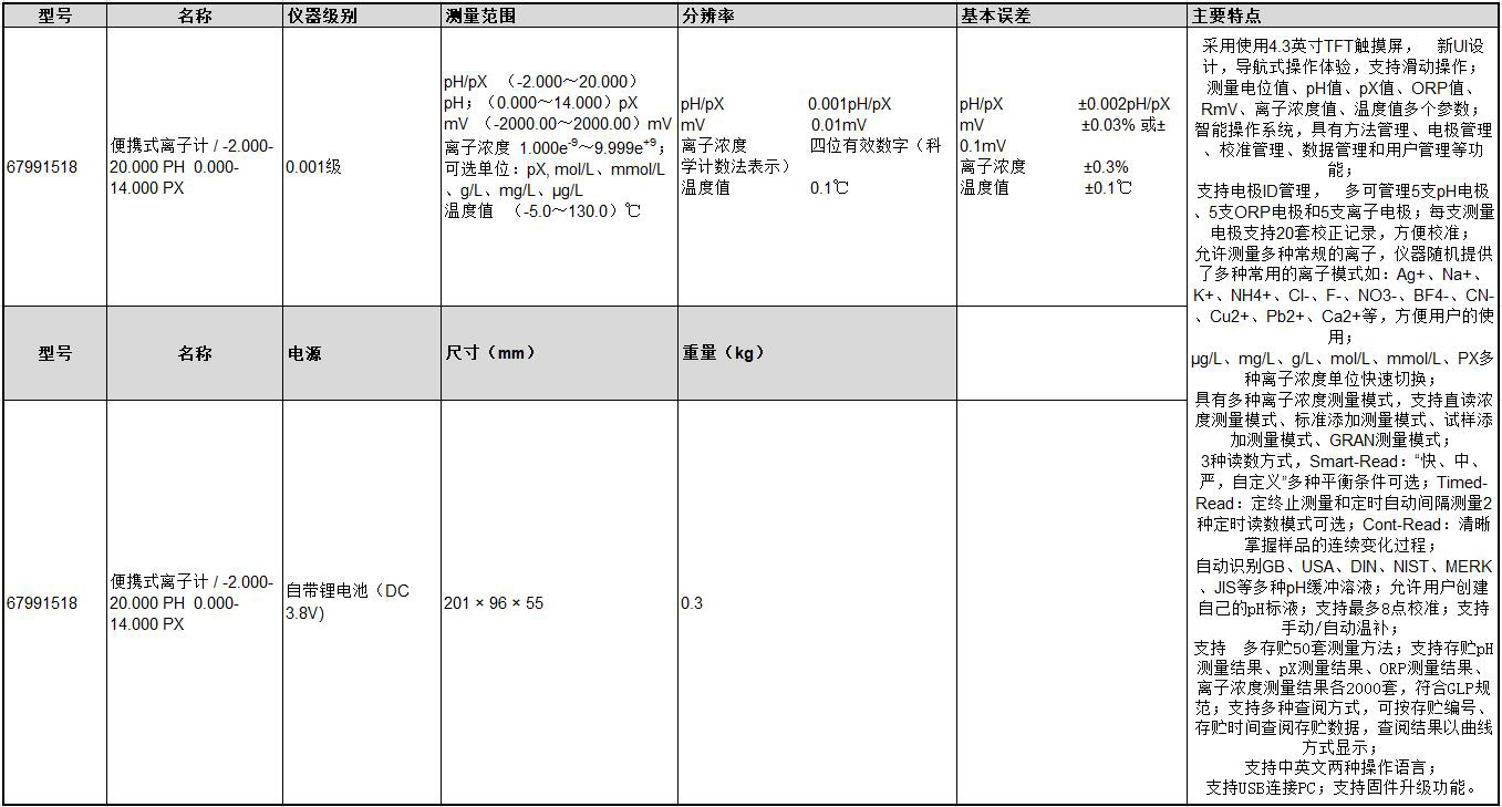 ·采用使用4.3英寸TFT触摸屏,全新UI设计,导航式操作体验,支持滑动操作; ·测量电位值、pH值、pX值、ORP值、RmV、离子浓度值、温度值多个参数; ·智能操作系统,具有方法管理、电极管理、校准管理、数据管理和用户管理等功能; ·支持电极ID管理,较多可管理5支pH电极、5支ORP电极和5支离子电极;每支测量电极支持20套校正记录,方便校准; ·允许测量多种常规的离子,仪器随机提供了多种常用的离子模式如:Ag+、Na+、K+、NH4+、Cl-、F-、NO3-、BF4-、CN-、Cu2+、Pb2+、Ca2+等,方便用户的使用; ·μg/L、mg/L、g/L、mol/L、mmol/L、PX多种离子浓度单位快速切换; ·具有多种离子浓度测量模式,支持直读浓度测量模式、标准添加测量模式、试样添加测量模式、GRAN测量模式; ·3种读数方式,Smart-Read:“快、中、严,自定义”多种平衡条件可选;Timed-Read:定终止测量和定时自动间隔测量2种定时读数模式可选;Cont-Read:清晰掌握样品的连续变化过程; ·自动识别GB、USA、DIN、NIST、MERK、JIS等多种pH缓冲溶液;允许用户创建自己的pH标液;支持较多8点校准;支持手动/自动温补; ·支持较多存贮50套测量方法;支持存贮pH测量结果、pX测量结果、ORP测量结果、离子浓度测量结果各2000套,符合GLP规范;支持多种查阅方式,可按存贮编号、存贮时间查阅存贮数据,查阅结果以曲线方式显示; ·支持中英文两种操作语言; ·支持USB连接PC;支持固件升级功能。