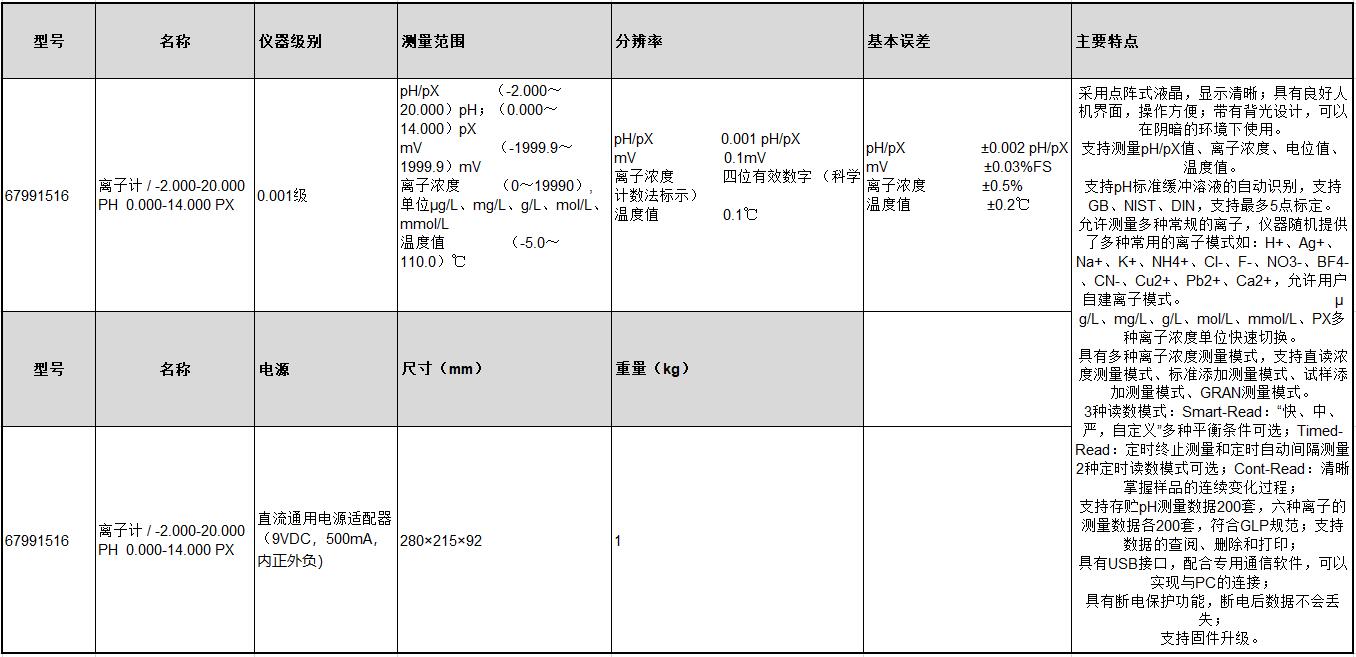·7寸彩色触摸屏,导航式操作; ·支持测量电位值、pH值、pX值、ORP值、离子浓度值和温度值; ·智能化操作系统,具有方法管理、电极管理、校准管理、数据管理和用户管理等功能; ·支持电极管理,较多可管理5支pH电极、5支ORP电极和5支离子电极;每支电极可保存20套校正记录;支持校准编辑功能,方便校准; 允许测量多种常规的离子,仪器随机提供了多种常用的离子模式如:H+、Ag+、Na+、K+、NH4+、Cl-、F-、NO3-、BF4-、CN-、Cu2+、Pb2+、Ca2+,方便用户的使用; ·μg/L、mg/L、g/L、mol/L、mmol/L、PX多种离子浓度单位快速切换; ·具有多种离子浓度测量模式,支持直读浓度测量模式、标准添加测量模式、试样添加测量模式、GRAN测量模式; ·3种读数模式:Smart-Read:“快、中、严,自定义”多种平衡条件可选;Timed-Read:定时终止测量和定时自动间隔测量2种定时读数模式可选;Cont-Read:清晰掌握样品的连续变化过程; ·自动识别GB、DIN、NIST等25种缓冲溶液,允许用户创建自己的pH标液;支持自动1-6点校准;支持手动/自动温补; ·支持较多存贮100套测量方法;支持存贮pH、pX、ORP和离子浓度测量结果各1000套,符合GLP规范;具有数据统计功能,允许用户将测量结果进行统计、查阅、分析、比较、保存; ·支持USB、RS232连接PC、串口打印机;允许打印输出测量结果; ·支持中英文语言;支持固件升级,支持U盘热插拔;支持直接连接自动进样器。